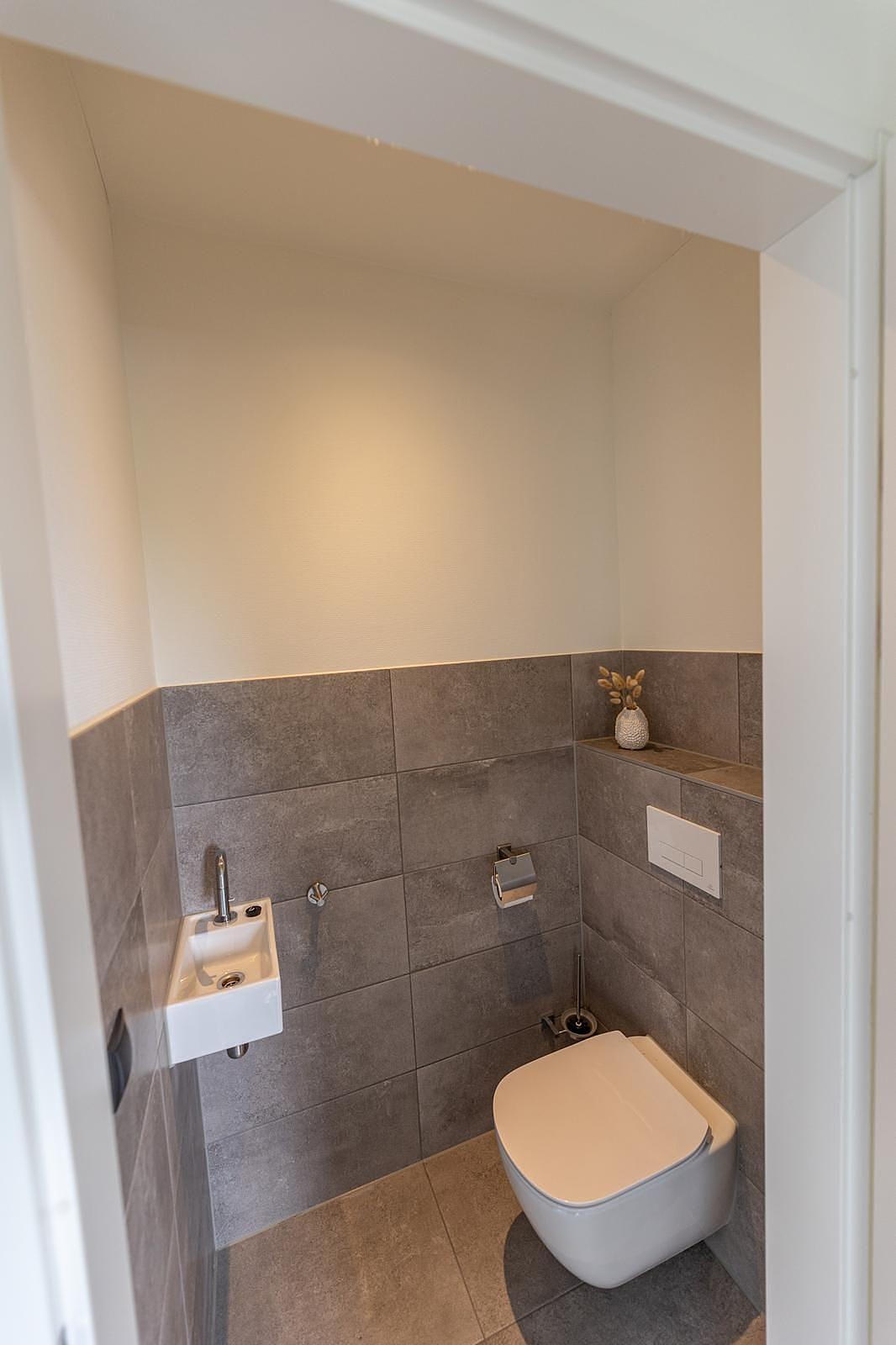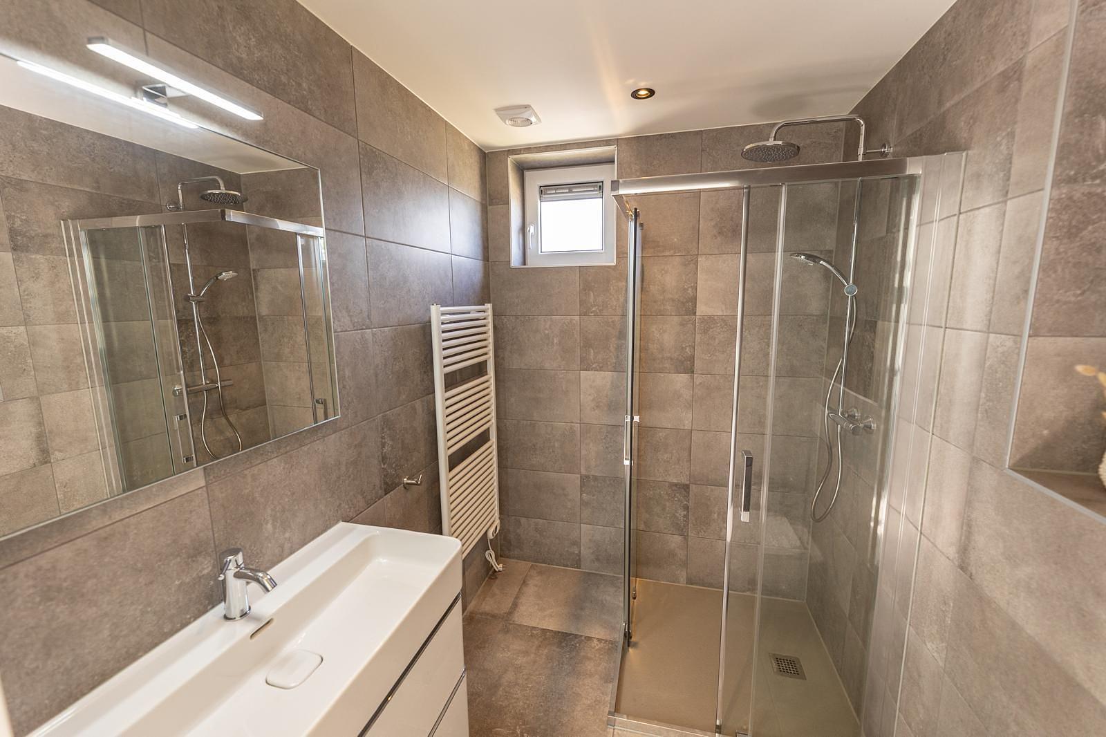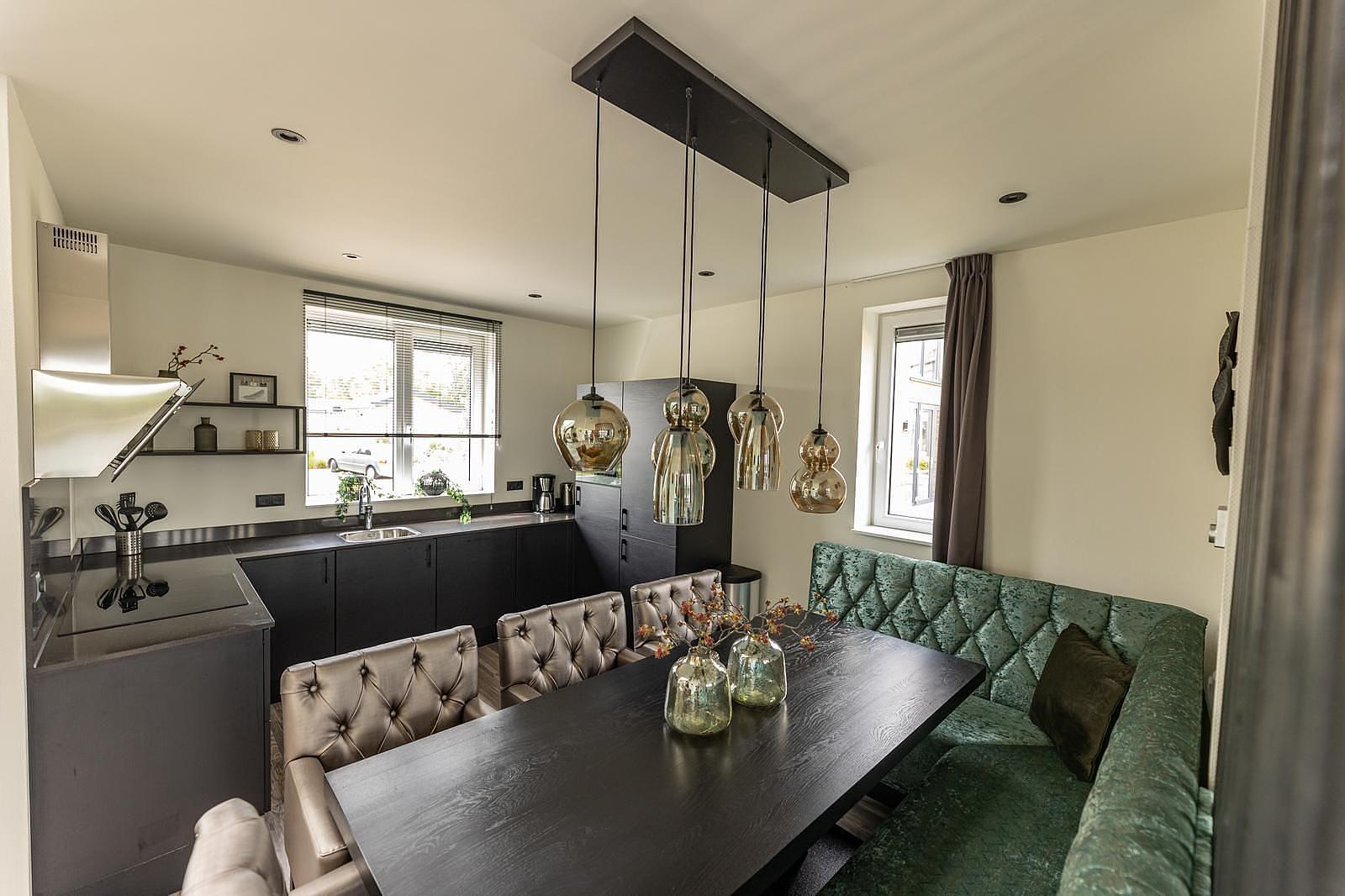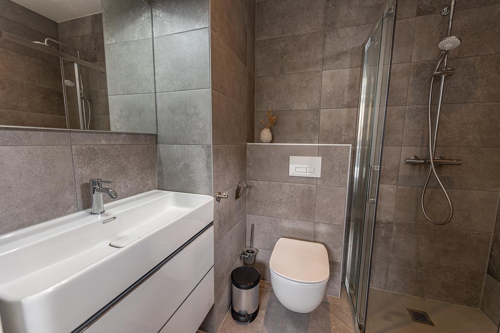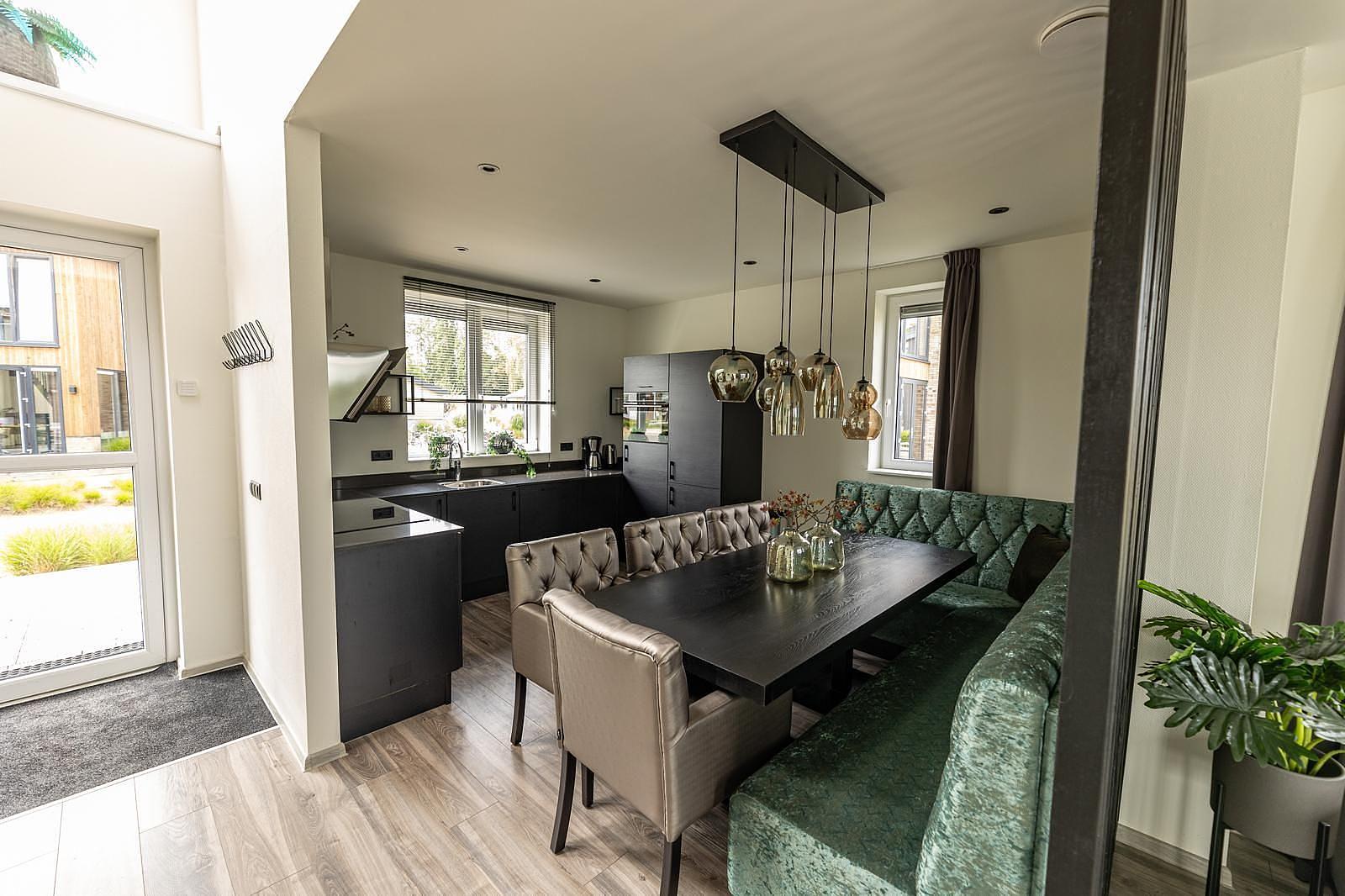 Im Inneren fällt sofort das natürliche Licht auf, das das Wohnzimmer besonders geräumig macht. Die Sitzecke und der große Esstisch bieten mehr als genug Platz zum Entspannen oder für gemeinsame Mahlzeiten. Die moderne Küche ist komplett ausgestattet und verfügt über ein Induktionskochfeld, einen Geschirrspüler und eine Kombi-Mikrowelle, ideal zum Kochen für größere Gruppen. Ebenfalls im Erdgeschoss befinden sich ein Schlafzimmer, ein Badezimmer und eine separate Toilette.